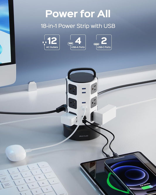 【10ft】 Power Strip Tower JACKYLED Surge Protector Electric Charging Station with 13A 12 Outlets 6 USB Ports Heavy Duty Extension Cord for Home Office Computer Nightstand Laptop Phone White Black