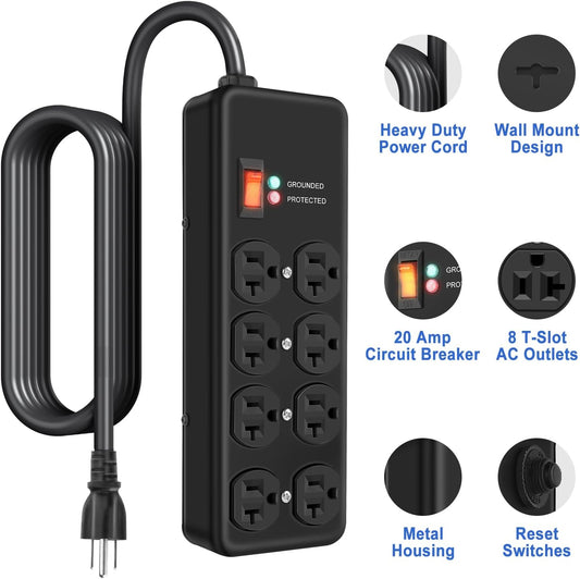 20Amp Power Strip Surge Protector, Durable Metal 8-Outlet with Heavy Duty 20 Amp 10Ft 12 Gauge Extension Cord, for Garage, Workshop & Industrial Use with 6-20R T-Slot Outlets, 4800J