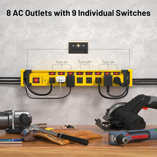 Plug'n 8 Outlet Long Power Strip,2700J Surge Protector with Individual Switches,Wide Spaced,Heavy Duty Power Strip with 6FT/14AWG/15A Power Cord and Flat Plug for Workshop,Garage,Industrial,Home