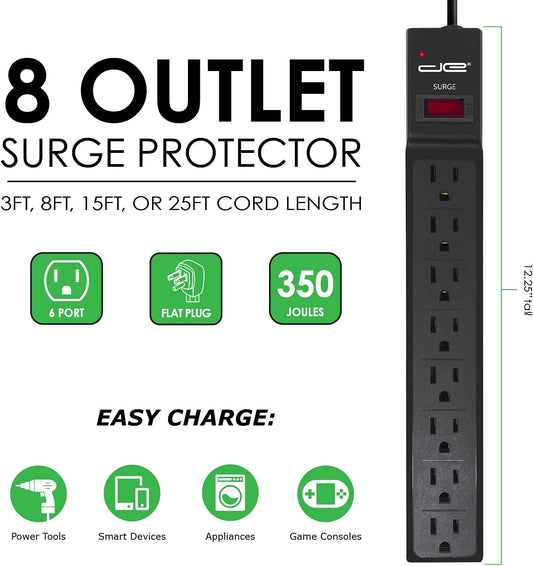 Digital Energy 8 Outlet Surge Protector Power Strip - 15 AMP, 1875 W, 125 V, 350 J Surge Protection, ETL Listed - Flat Plug, Black, 3 FT