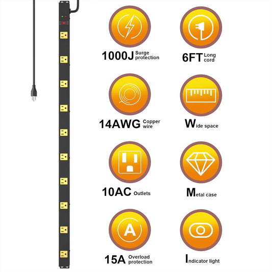 10 Outlet Long Power Strip Surge Protector, Heavy Duty Industrial Metal Power Strip 6 Feet, Wall Mountable, for Work Bench, Shop, Garage, Black (1000 Joules)