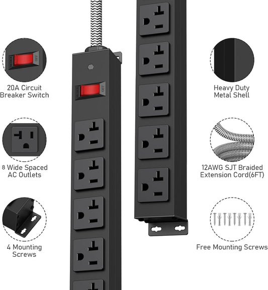 20Amp Power Strip Surge Protector, Long Metal 8-Outlets with Heavy Duty 20 amp 6Ft 12 Gauge Extension Cord for Garage Workshop & Industrial Use, 1200J