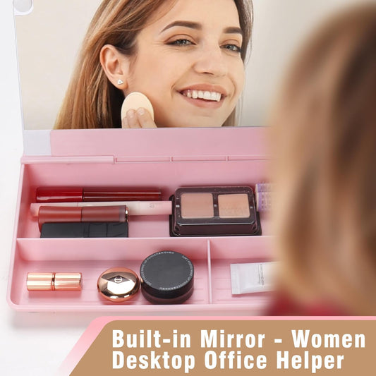 SELEAD Desktop Glass Whiteboard with Organizer & Built-in Mirror - Small Dry Erase White Board Computer Pad Keyboard Stand with Markers, Eraser, Holder for Women Girls - Pink