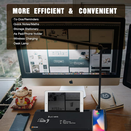 SELEAD Desktop Glass Whiteboard with Wireless Charger Station and Desk Lamp, Tabletop Dry Erase Board w/Organizer, Markers, Mirror, Holder for Home School Office Desk Accessories, Black