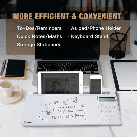 SELEAD Desktop Glass Whiteboard with Calculator, Organizer, Markers, Eraser, Holder - Small Dry Erase White Board Computer Pad Keyboard Stand Desk Drawer Accessories for Home, School, Office