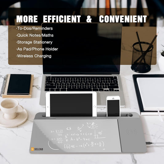 SELEAD Desktop Glass Whiteboard with Wireless Charger Station, Dry Erase White Board Computer Pad Keyboard Stand with Organizer for Home, School, Office Desk Accessories, Gray