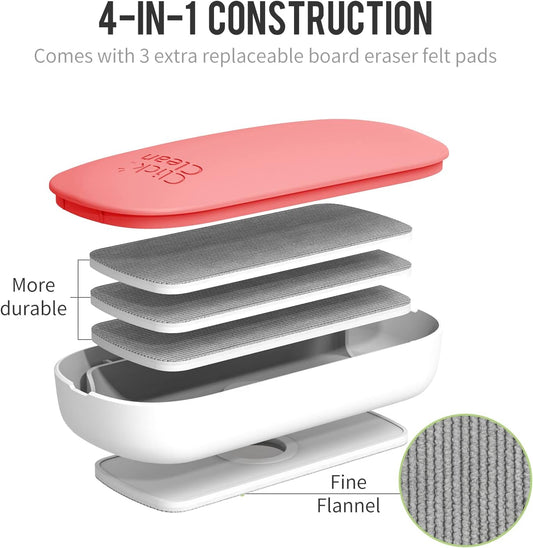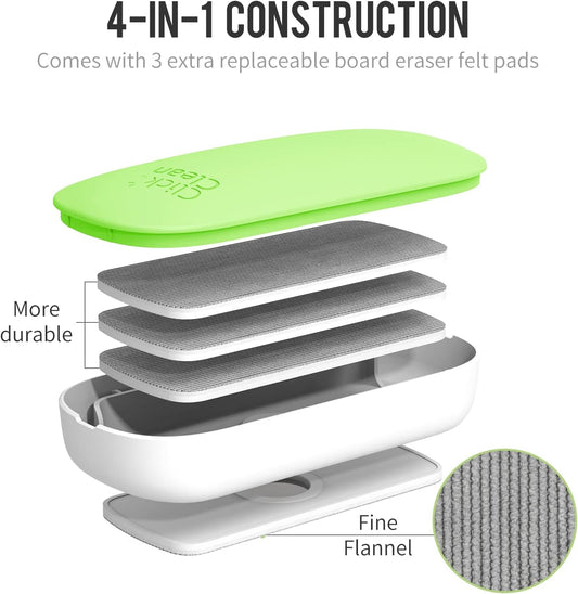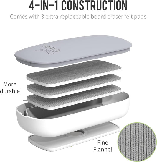 CLICK CLEAN Replaceable Dry Erase Board Eraser, 4-in-1 Magnetic Whiteboard Eraser with 3 Replaceable Felt Pads, Free 3.4oz Whiteboard Cleaner Included, Intended for Classroom, Home and Office