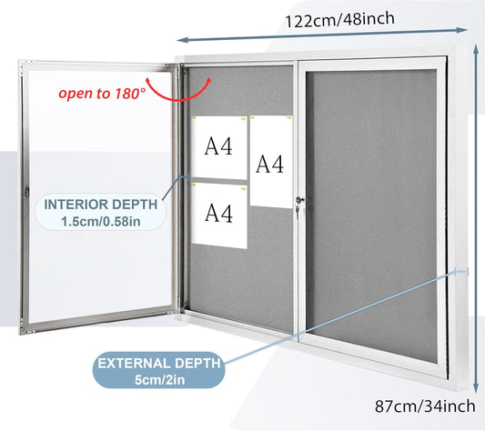 Outdoor Bulletin Board Weatherproof 48x36 in,Enclosed Bulletin Board with Locking Door, Wall Display Case for Office School Home Commercial, Silver Aluminum Frame, Gery Felt