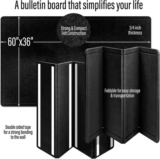 Large Bulletin Board 60 x 36 Inches - Foldable Felt Bulletin Board for Wall, Cork Board Alternative with 100 Color Pins & 12 Note Pads, Vision Board - Black
