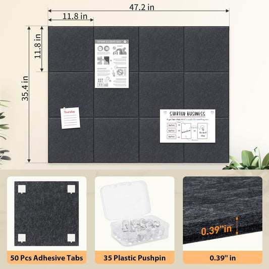 Smarpau Large Felt Cork Board, 12 Pack Black Bulletin Board for Walls 48"x36", Corkboards with Safe Removable Adhesive Tabs Pushpins, Cork Bulletin Board for Home Office