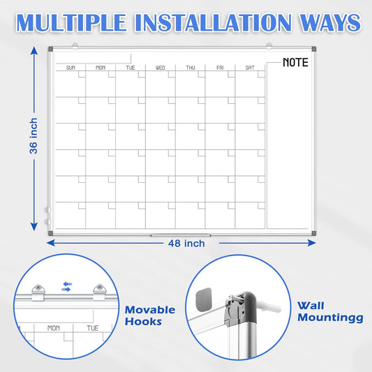Monthly Calendar Dry Erase Whiteboard for Wall, 36" x 24" Double-Sided Calendar White Board, Magnetic Portable Board for Office, Kitchen, School, Home
