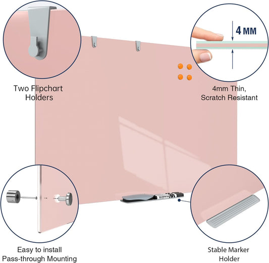 TSJ OFFICE Glass Dry-Erase Board - 36 x 24 Inches Wall Mounted Magnetic Whiteboard, Large Frameless Glass White Board for Office, Home & School, Pink