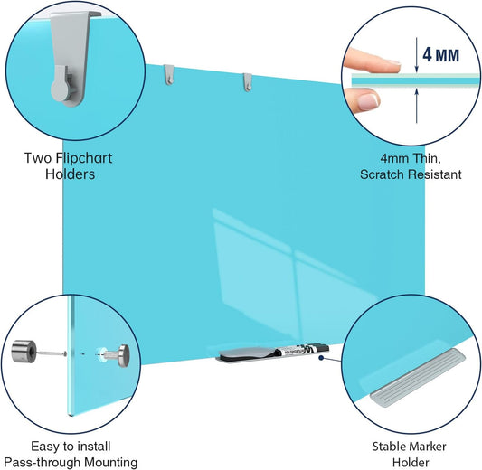 TSJ OFFICE Glass Dry-Erase Board - 36 x 24 Inches Wall Mounted Magnetic Whiteboard, Large Frameless Glass White Board for Office, Home & School, Blue