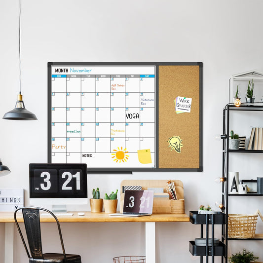 XBoard Dry Erase Calendar Whiteboard 28 X 20 - Combo White Board Calendar Monthly, Magnetic White Board + Corkboard with Black Aluminum Frame