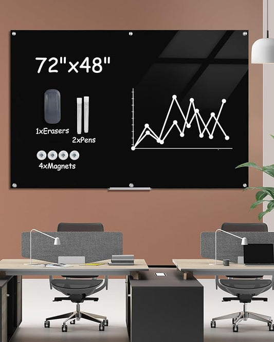 Magnetic Glass Whiteboard,72"x48" Wall Mounted Frameless Dry Erase Board for Office, Home & School Black