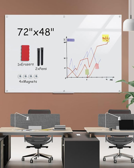 Magnetic Glass Whiteboard,72"x48" Wall Mounted Frameless Dry Erase Board for Office, Home & School Ultra White