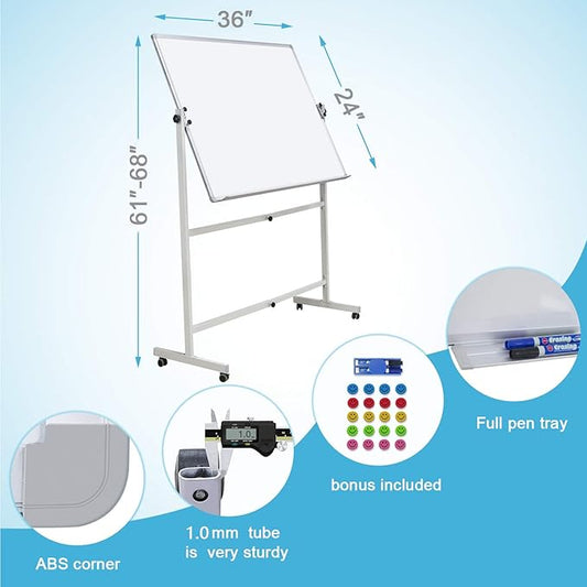 Rolling Dry Erase Board 24 x 48 - Large Portable Magnetic Whiteboard with Stand - Double Sided Easel Style Whiteboard with Wheels - Mobile Standing White Board for Office, Classroom & Home