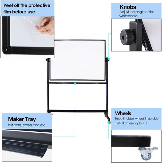 48" x 24" Magnetic Mobile Whiteboard - 360° Reversible Double-Sided Dry Erase Board with Wheels, Portable Standing Whiteboard Easel for Office & Classroom - Includes 6 Markers + 1 Eraser