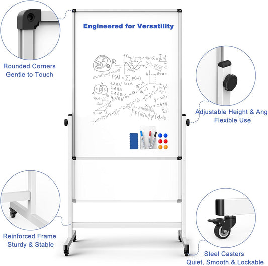 Large Dry Erase White Board with Rolling Stand 72"x48" Double-Sided Mobile Magnetic Whiteboard on Wheels, Including 3 Magnetic Erasers, 7 Markers, 30 Magnets