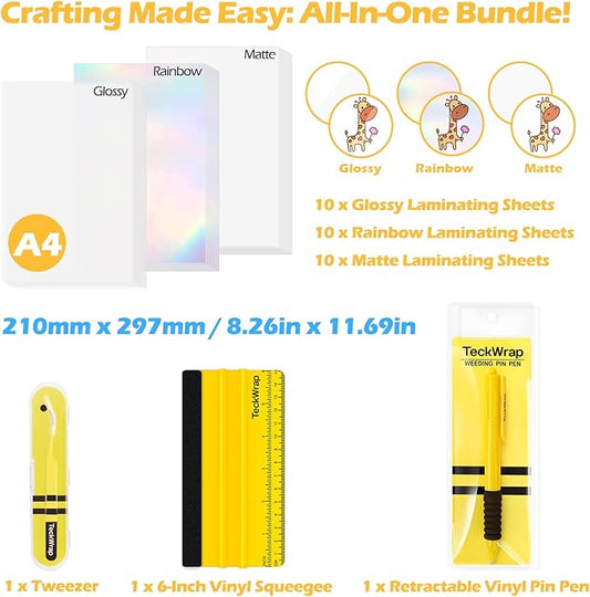 TECKWRAP Laminating Sheets Sticker Paper Laminate Sheets for Photo Paper Inkjet Printable Vinyl Squeegee Tools A4 30PCS Clear Overlay Transfer Paper, Matte Lamination Sheets, Holographic Stickers