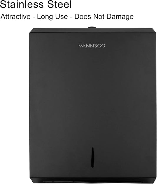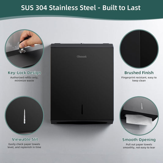 Commercial Paper Towel Dispenser Wall Mount 400-Sheet Capacity Matte Black Stainless Steel Lockable Fits Multifold/Z-Fold Towels (Folded Size ≤ 10.6" x 3.9")
