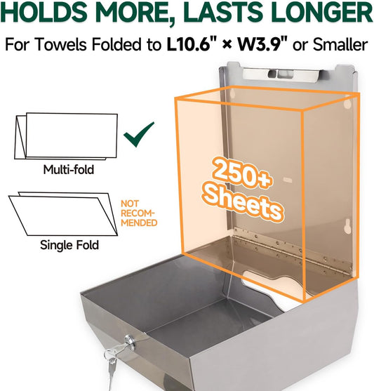 Wall Mount Paper Towel Dispenser 250-Sheet Capacity Brushed Stainless Steel Lockable Fits Multifold/Z-Fold Towels (Folded Size ≤ 10.6" x 3.9")