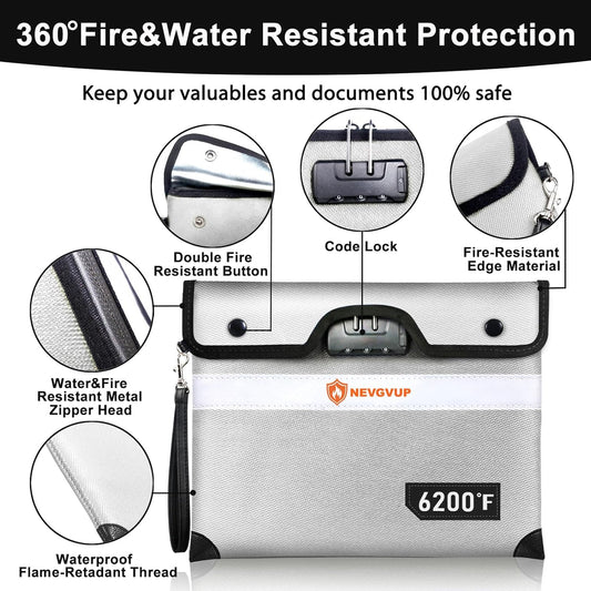 6200°F Fireproof Money Bag with Lock, Upgraded Fireproof Bags w. Zipper/Reflective Strip, 9 Layers of Heat Insulated Materials, Water Resistant Fire proof Money Bag for Cash, Fire Pouch for A5 Files