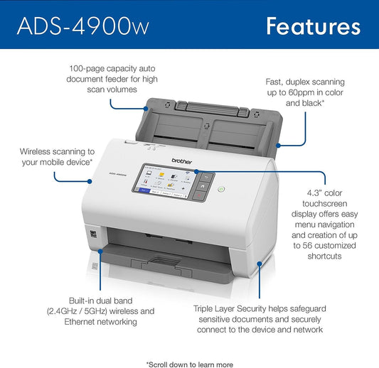 Brother ADS-4900W Professional Desktop Scanner with Fast Scan Speeds, Duplex, Wireless, and Large Touchscreen, White
