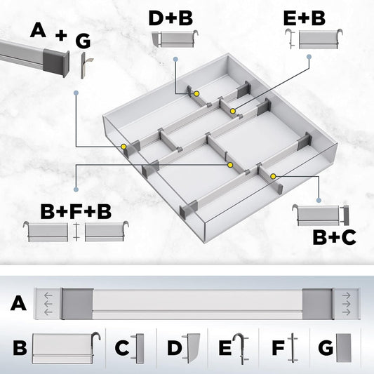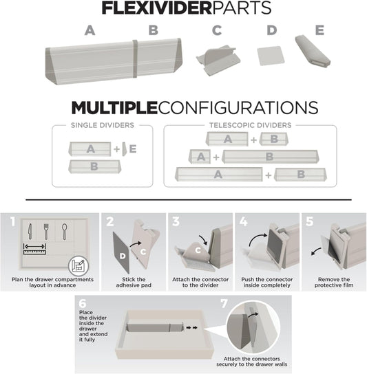 Practical Comfort FLEXIVIDER Aluminum Drawer Organizer - 9 Telescopic Dividers Set - Champagne