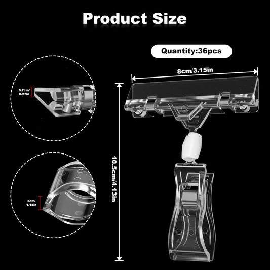36 Pcs Clear Sign Clips – Double-Sided Rotatable POP Plastic Label Holders for Retail Display, Shelves, Clothing Racks & Price Tags