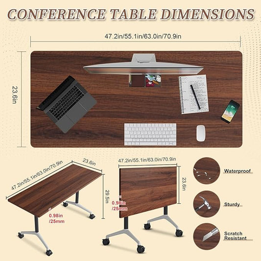 Folding Conference Room Table, Modern Conference Tables with Wheels, Large Rectangular Mobile Training Tables for Office Classroom, Foldable Modular Boardroom Seminar Table Walnut (6pack L70.9in)