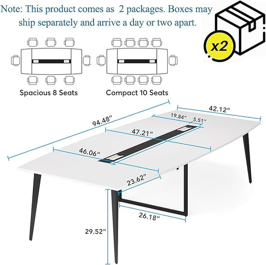 Tribesigns 8FT Conference Table, 94.48L x 47.21W x 29.52H Inches Boat Shaped Meeting Table with Rectangle Grommet, Modern Seminar Table for Office Meeting Conference Room (White & Black, 8ft)