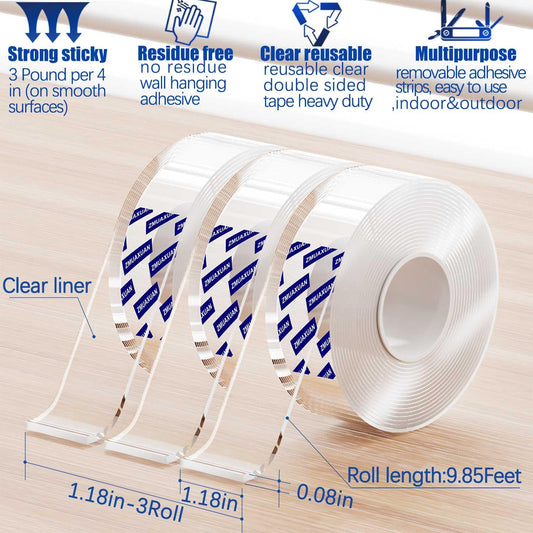 Clear Double Sided Adhesive Mounting Tape Heavy Duty Removable,Strong Picture Hanging Strips Wall Hangers,Sticky Tack Gel Putty Glue for Poster,Photo,Mirror,Carpet(9.85 Ft-3 Pack)