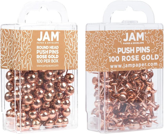 JAM PAPER Colorful Push Pins - Flat & Round Head Thumb Tack Combo Set - Rose Gold Pushpins - 200/Pack