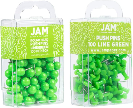 JAM PAPER Colorful Push Pins - Flat & Round Head Thumb Tack Combo Set - Lime Green Pushpins - 200/Pack