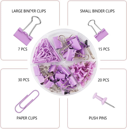 Purple Binder Clips and Paper Clips Push Pins Tacks Sets, Total 72 PCS Assorted Sizes Office Supplies Set for Women, Student, School, Home & Desk Supplies