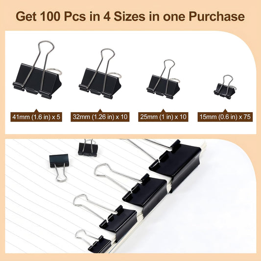 Black Binder Clips Assorted Sizes - Coideal 100 Pcs Metal Binder Paper Clips Foldback Bulldog Clip Clamps for Office School (Mini, Small, Medium, Large)