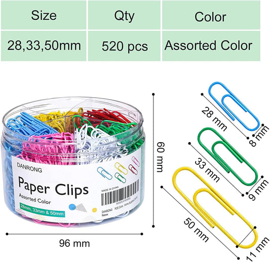 520 PCS Colored Paper Clips Assorted Sizes, Small Medium and Large (1.1", 1.3" & 2"), Colorful Paperclips for Office, School, Home Supplies-Colored