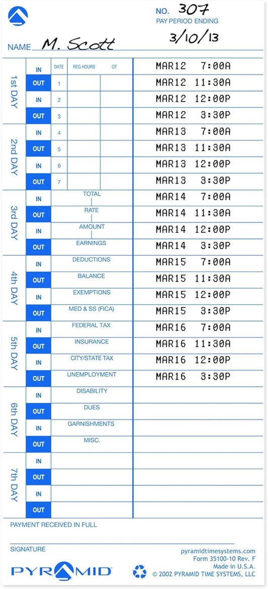 Pyramid Time Systems - 30% Recycled Time Cards (35100-10PK5) for Pyramid Models 3500, 3500ss, 3600SS, and 3700 Time Clock and Document Stamp, Single Sided Time Sheets (4 X 9 in) - 500 Time Cards