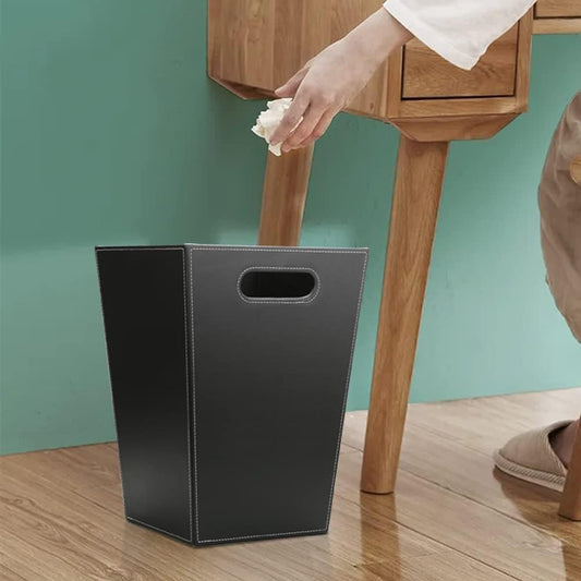 KINGFOM Classic Pu Leather Trash Can Wastebasket, Garbage Container Bin with Handles for Bathrooms, Powder Rooms, Kitchens, Home, Office and and High Class Hotel Square Black