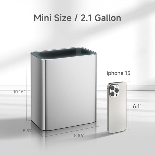 TIPGO Small Metal Trash Can, 2.1 Gallon Slim Trash Can for Bathroom, Wastebasket Garbage Bin for Bedroom, Office, Kitchen, Under Sink (Silver)