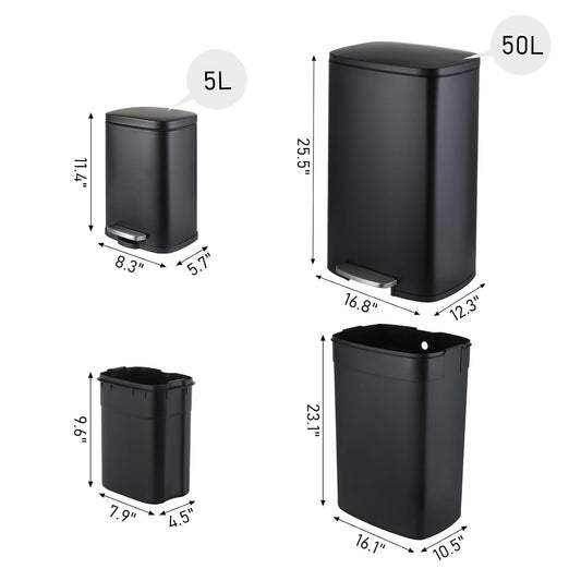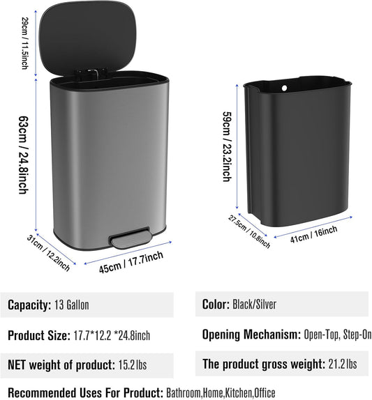 Arlopu 13.2+1.3 Gallon Step Trash Can, Stainless Steel Garbage Bin, Soft-Close Rubbish Bin with Removable Plastic Inner Bucket, Fingerprint-Proof, Lid Dustbin, for Kitchen Home (Black)