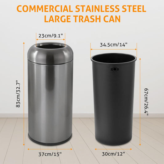 WICHEMI 16 Gallon Commercial Large Trash Can, Bullet Outdoor Trash Bin with Open Top Lid, Brushed Stainless Steel Garbage Can, Black