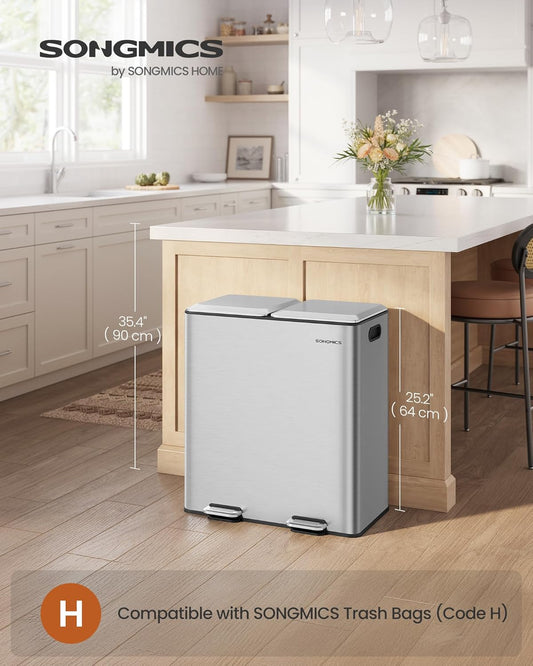 SONGMICS Trash Can, 2 x 8 Gallon (2 x 30 L) Double Garbage Can with Soft-Close Lids, Removable Inner Buckets, Pedals, Stainless Steel, for Waste and Recycling, Metallic Silver ULTB743E01