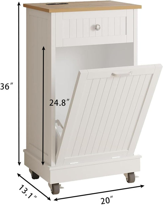 10 Gallon Tilt Out Trash Cabinet, Wooden Kitchen Trash Can Cabinet with Hideaway Drawer, Freestanding Laundry Hamper Garbage Recycling Cabinet on Wheels, Pet Proof, Single, White