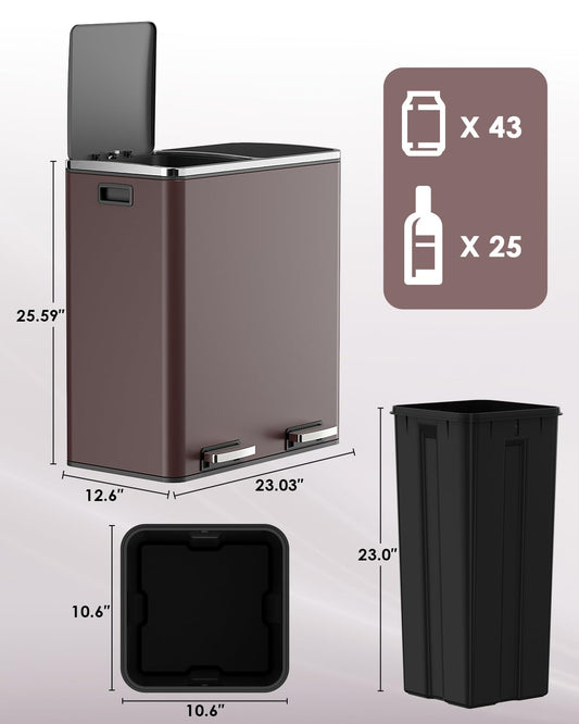 AthLike 60L(16 Gal) Dual Trash Can, Stainless Steel Kitchen Garbage Can, Double Compartment Classified Rubbish Bin, Recycle Dustbin w/Plastic Inner Buckets, Handle, Soft-Close Lid, Airtight, Brown