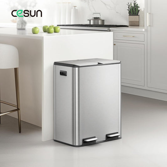 Cesun Kitchen Trash Can, 8 + 8 Gallon Dual Trash and Recycle Bin Combo, 2 Compartment Stainless Steel Kitchen Garbage Can with Lid, Removable Inner Buckets, Soft Close, Odor Filter, 30L+30L