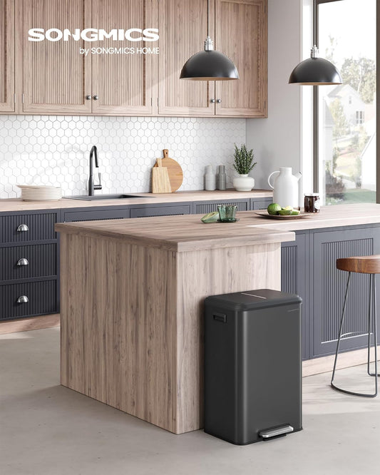 SONGMICS Trash Can, 2 x 8 Gallon (2 x 30 L) Garbage Can for Kitchen, with 15 Trash Bags, 2 Compartments, Plastic Inner Buckets and Hinged Lids, Airtight, Black ULTB60BK
