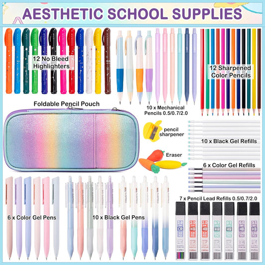 78PCS Aesthetic School Supplies with Cute Pencil Case, Pastel Highlighters Gel Pens Mechanical Pencils Set 0.5 0.7 & 2.0mm, Back to School Supplies Student Stationary Set, Pencil Pouch with Supplies