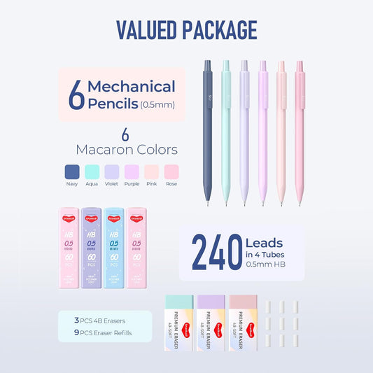 6PCS 0.5mm Mechanical Pencils Set with Case, Cute Pastel Mechanical Pencil with 240PCS HB Lead Refills, 3 Erasers, Aesthetic Back to School Supplies for Student Writing Drawing Sketching